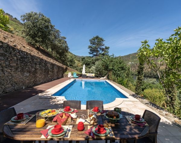Os devotos de Morfeu podem ainda alojar-se numa das três casas de xisto — cada qual com dois quartos, sala de estar e kitchenette —, nadar na piscina e aceder ao cais privado da propriedade, cercado pela telúrica paisagem do Douro.
